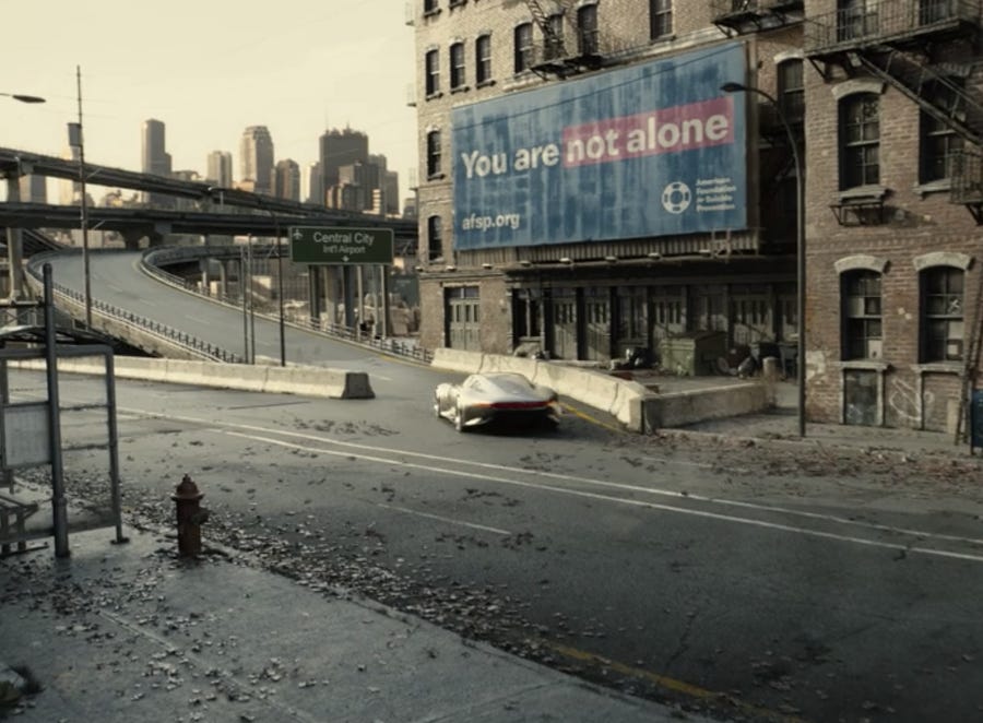 It feels silly to note that Justice League passes both the Bechdel and the racialized Bechdel test (low bars, both), but considering how many of Snyder’s films don’t do well by female characters, and are championed by toxic fans as “alternatives” to Marvel’s engagement with contemporary social justice discourse, it bears noting that Snyder’s Justice League naturalizes quite a bit of representational range (even going so far as to rename Arkham Asylum a “Home for the Emotionally Troubled”). Not surprisingly, either, considering his family’s loss, the film is dedicated to Autumn Snyder, and campaigns around its release have been used to raise funds for the American Foundation for Suicide Prevention. There’s even a billboard in the film promoting the organization, with the message YOU ARE NOT ALONE.